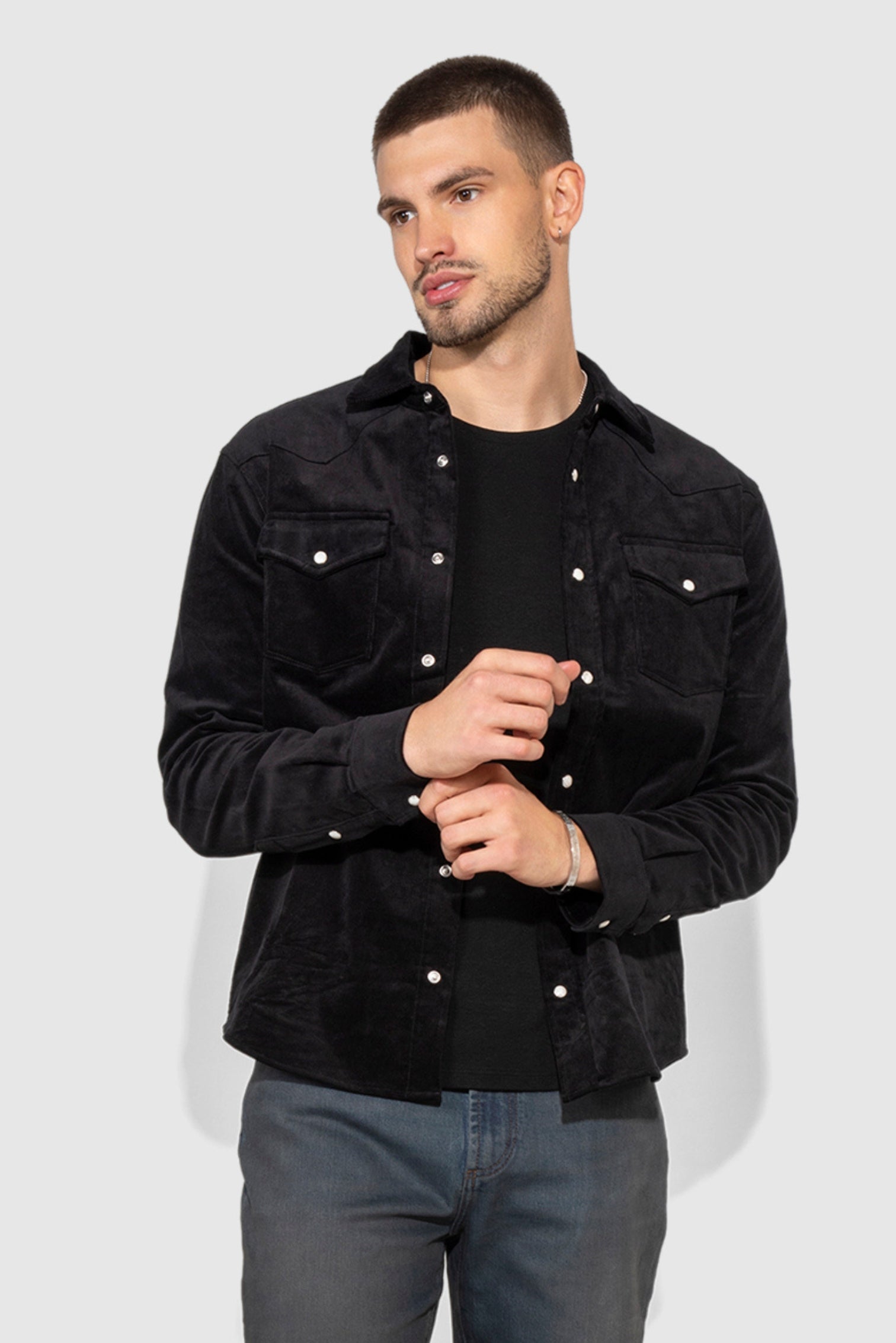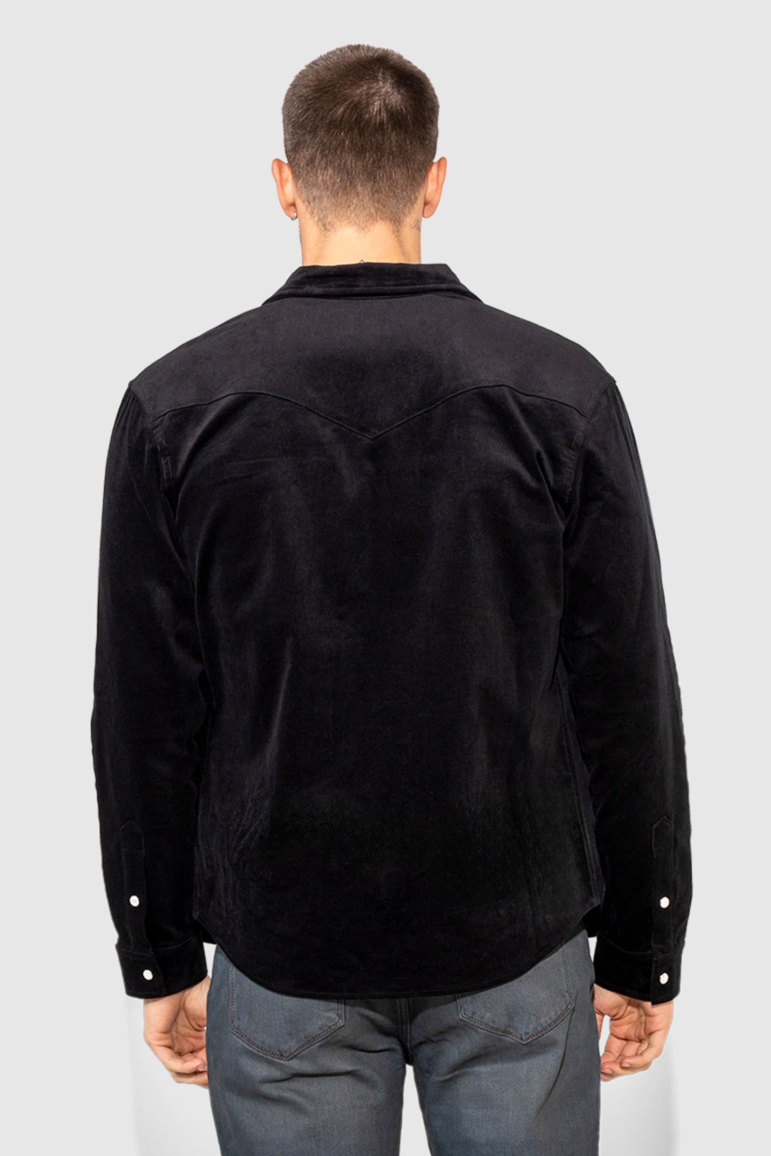 Eastwood Velvet Noir sharpens the Western frame in stretch velvet with a deep black finish that reads smooth and intentional. The fabric carries a subtle sheen that catches light softly while staying composed through movement. Snap button closures anchor the front and keep the stance defined, giving the shirt a refined edge that transitions easily from day to night.
