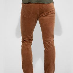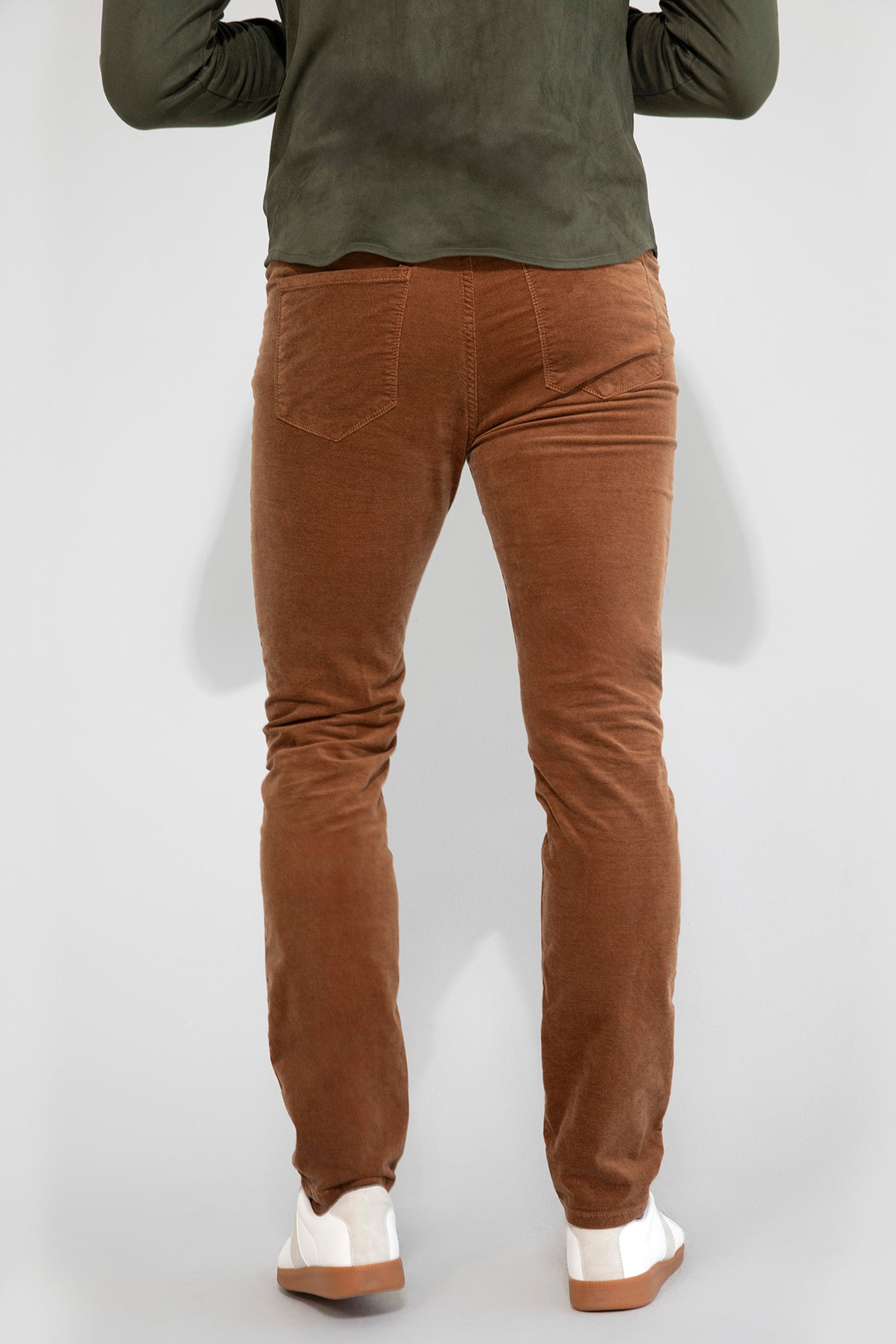 Brando Velvet Saddle sharpens the slim silhouette in stretch velvet with a silk blend that feels smooth and moves clean. The saddle tone reads warm and controlled, and the fabric’s subtle luster adds depth without flash.