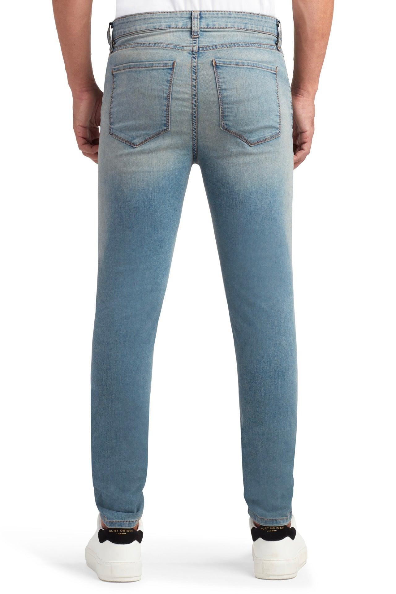 Cut for a Slim fit with a mid rise, Our Brando Chrysler are crafted of Stretch Japanese denim and styled with light fading and distressing at the thighs and pockets.
