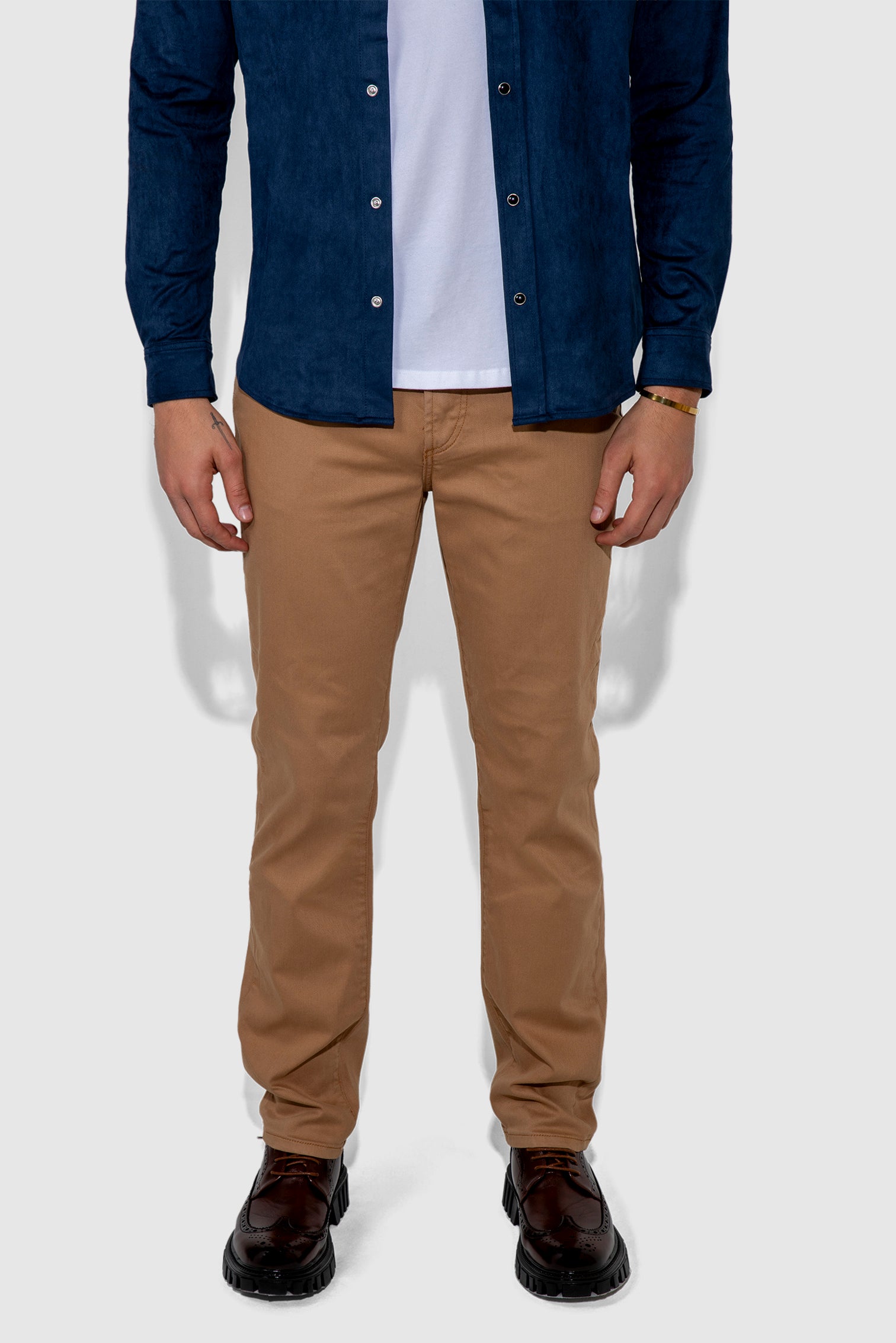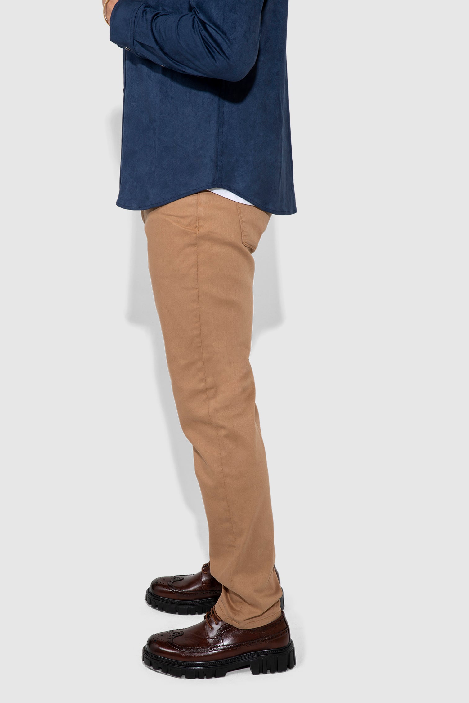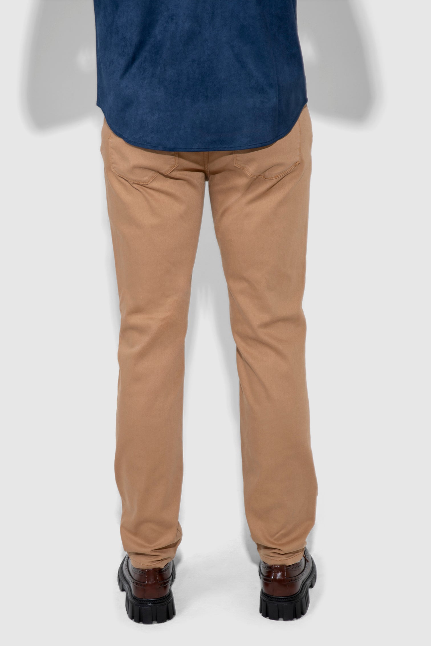 Brando Parisian Luxe Dune uses soft stretch twill with a matte finish that holds a crisp line and bends when you do. The deep juniper green brings composure and edge in equal measure, giving the slim profile a uniform quality you feel the second you pull it on.
