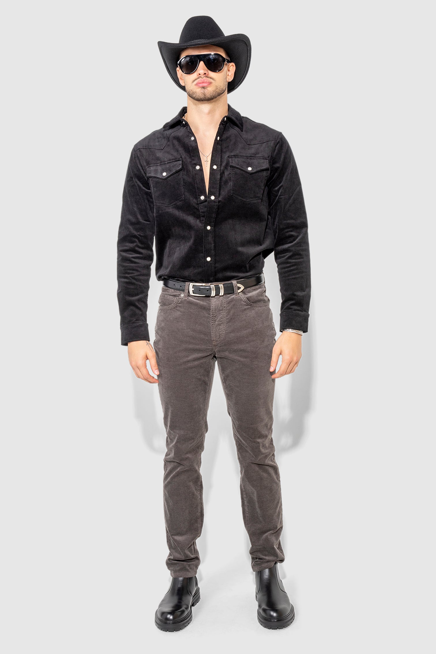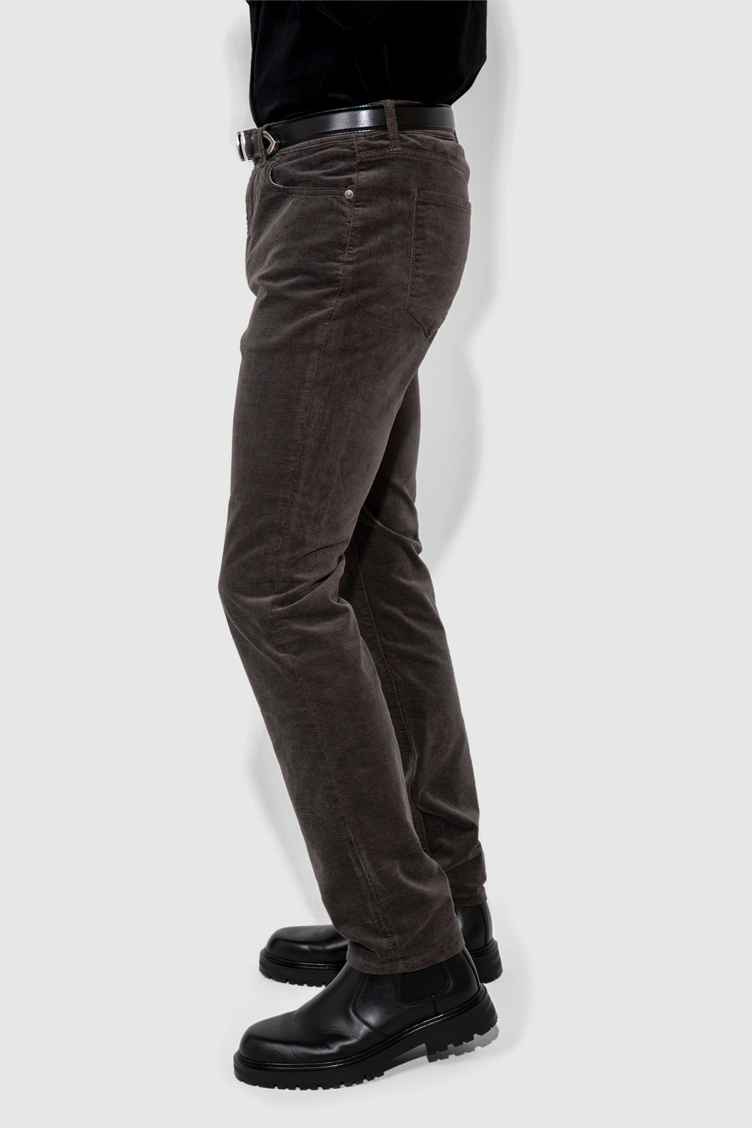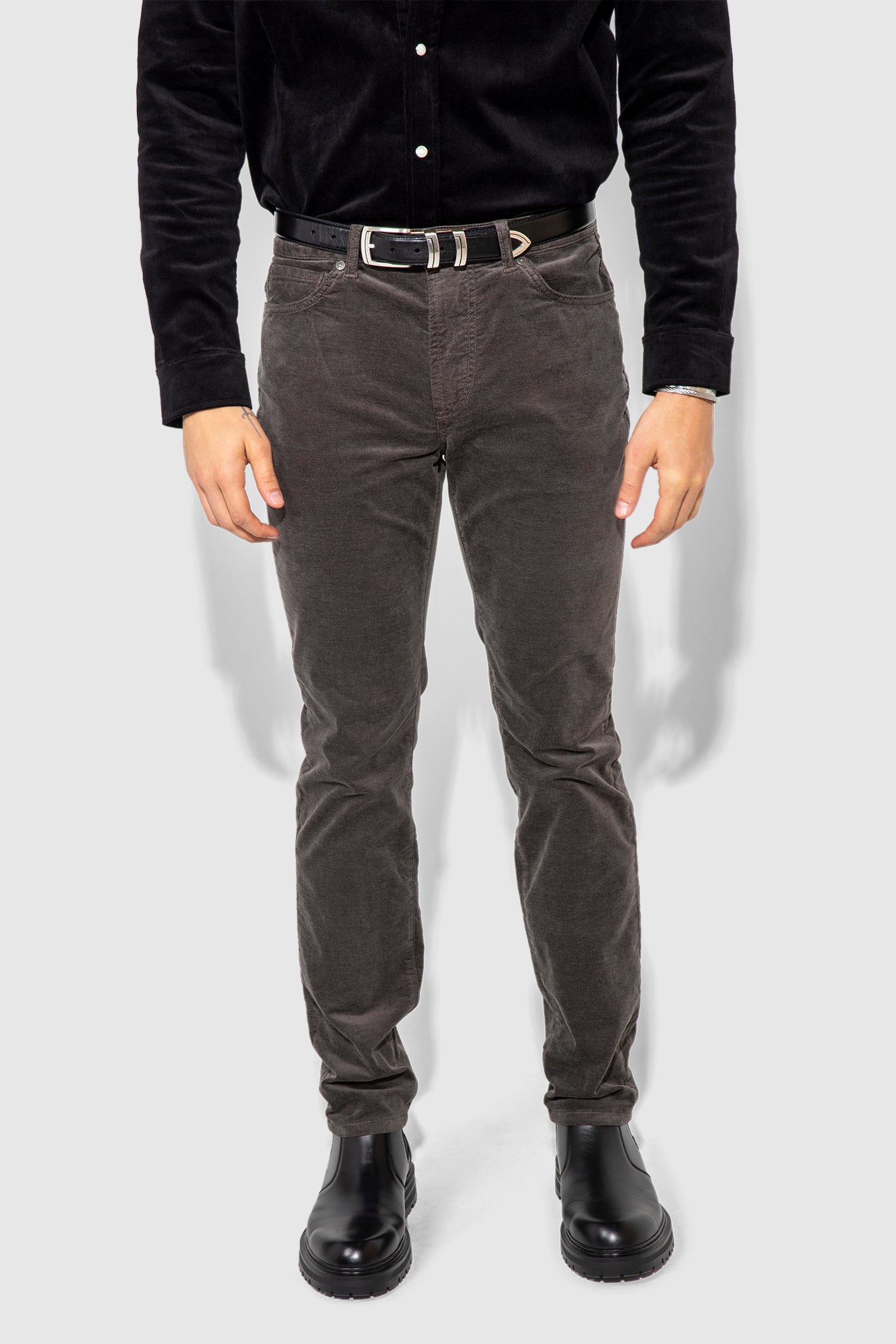Brando Velvet Carbon sharpens the slim silhouette in stretch velvet with a deep carbon tone that carries texture and depth. The fabric feels smooth with light structure, allowing the leg to stay close while moving easily throughout the day.