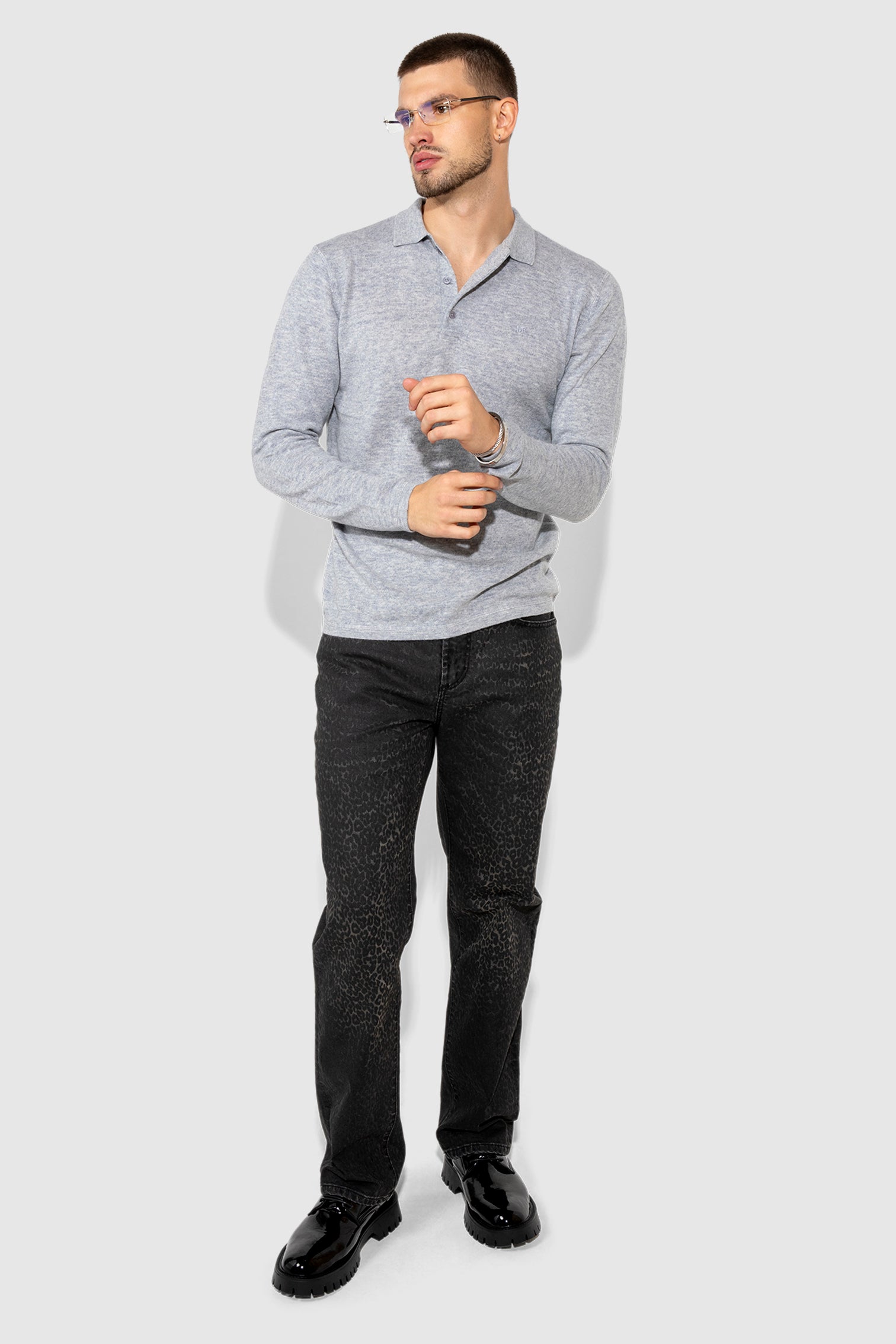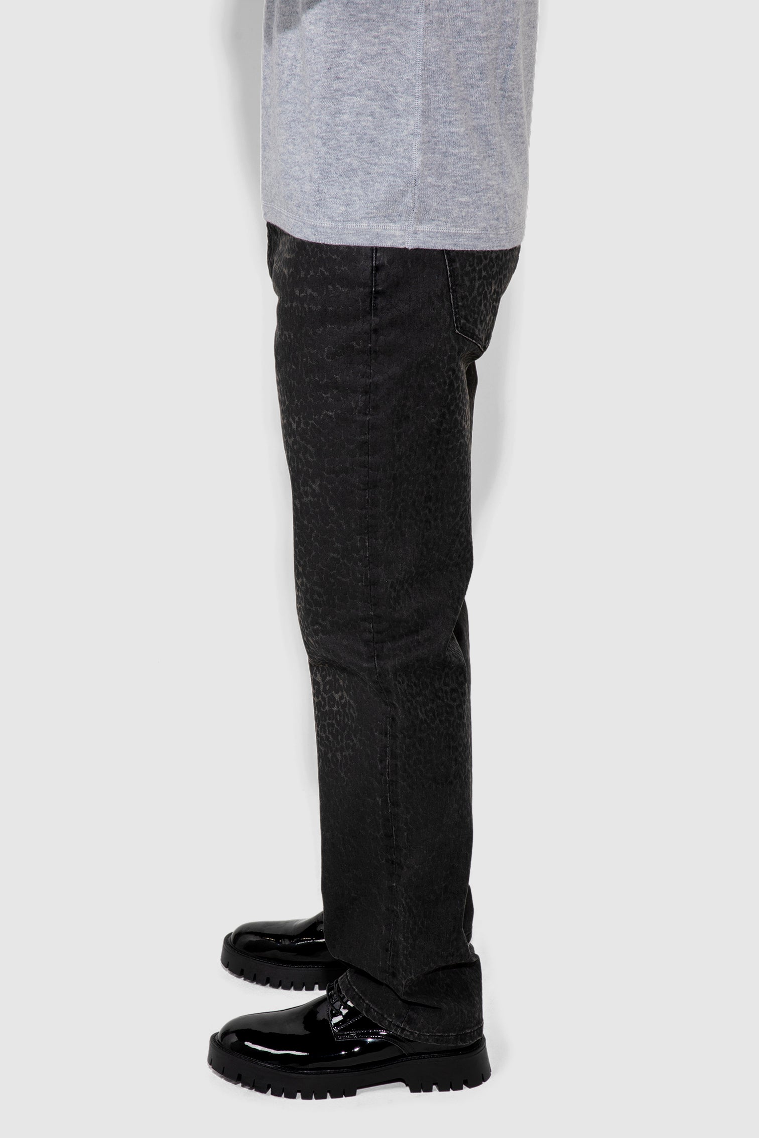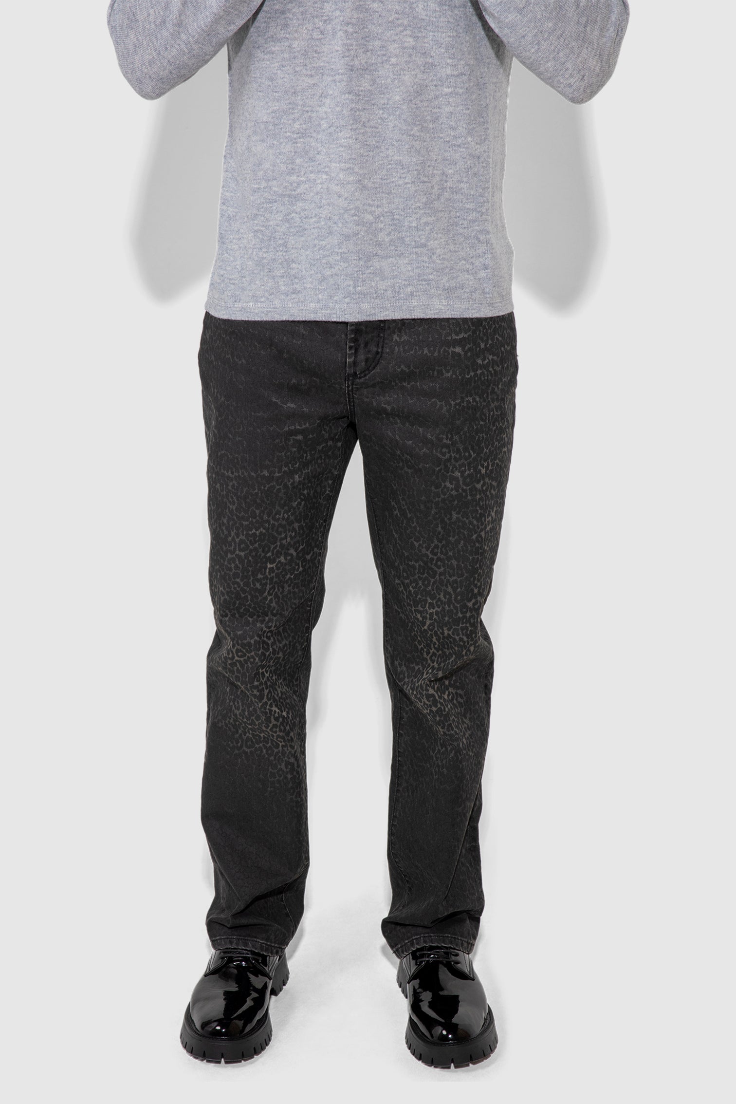 Caine Flocked Leopard introduces texture with restraint. The dark wash fades softly toward the center, creating depth, while a tonal leopard flock pattern sits just beneath the surface. Crafted in stretch rigid denim, the straight leg keeps the profile composed and wearable. A distinctive jean that reveals itself slowly and wears with confidence.