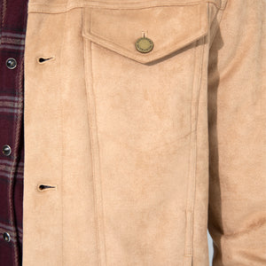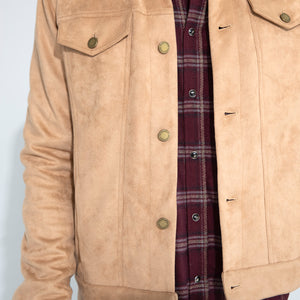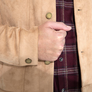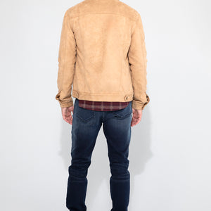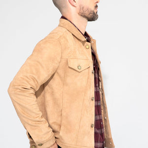 The Dean in butter soft Khaki Suede brings the trucker jacket’s structure into a smoother register, pairing a clean, close fit with a supple hand that drapes without losing shape. The tone is calm and controlled, and the suede gives it a depth you feel before you see.