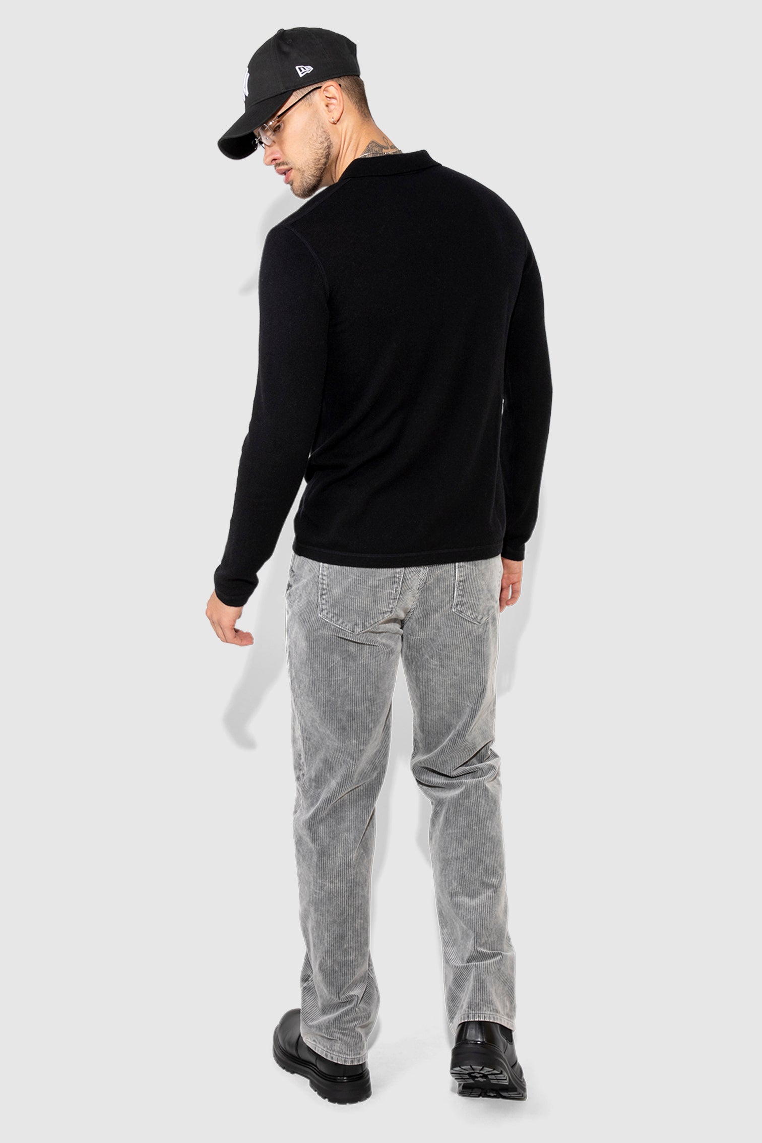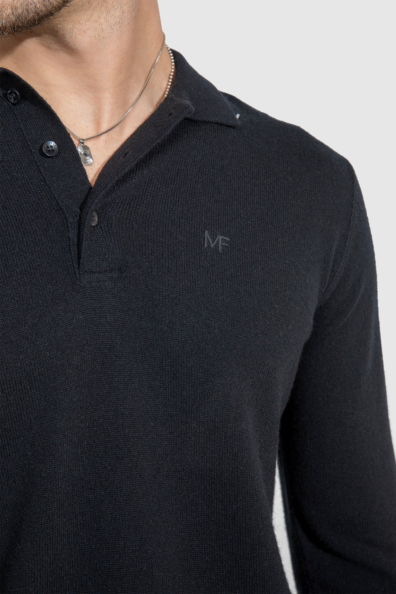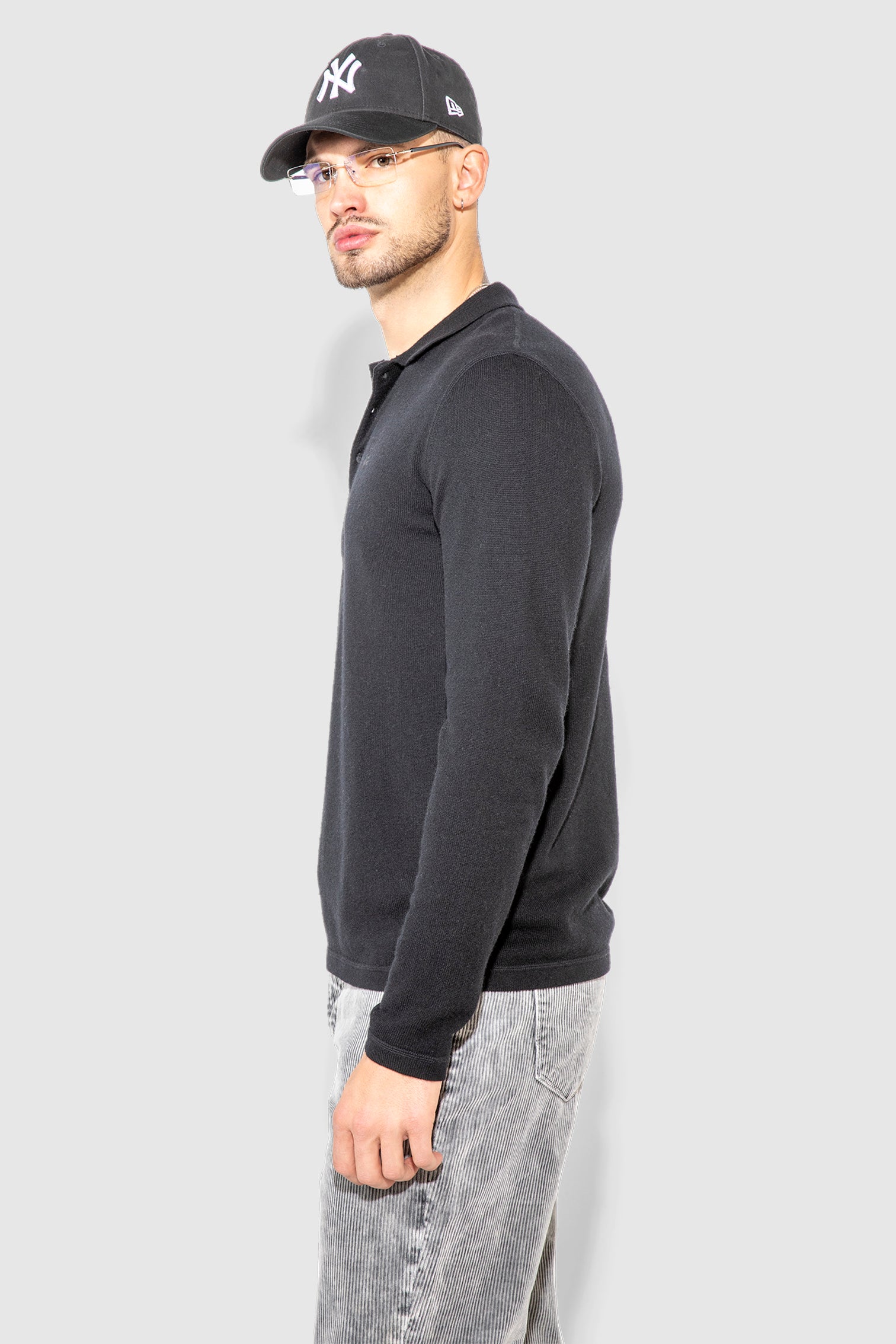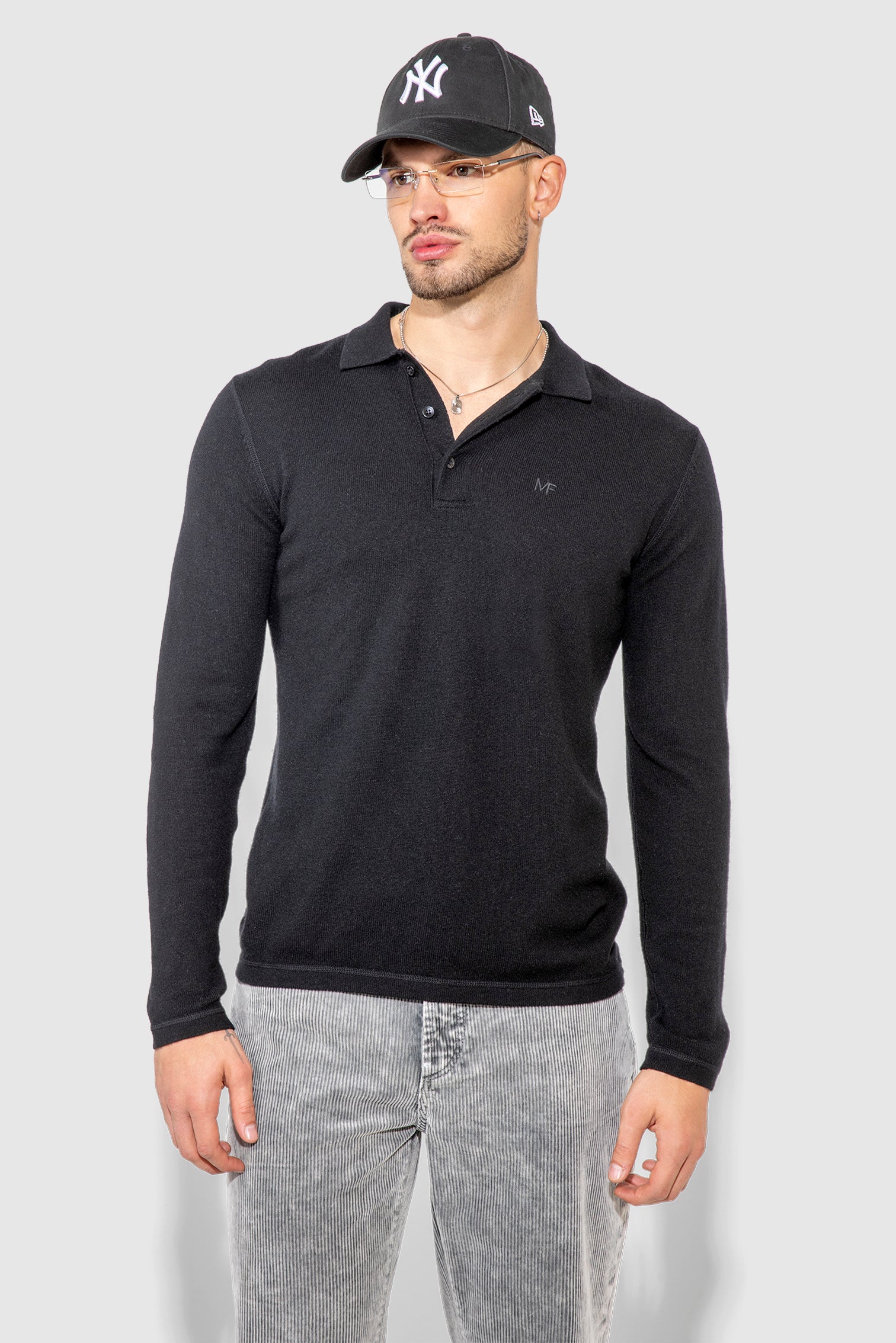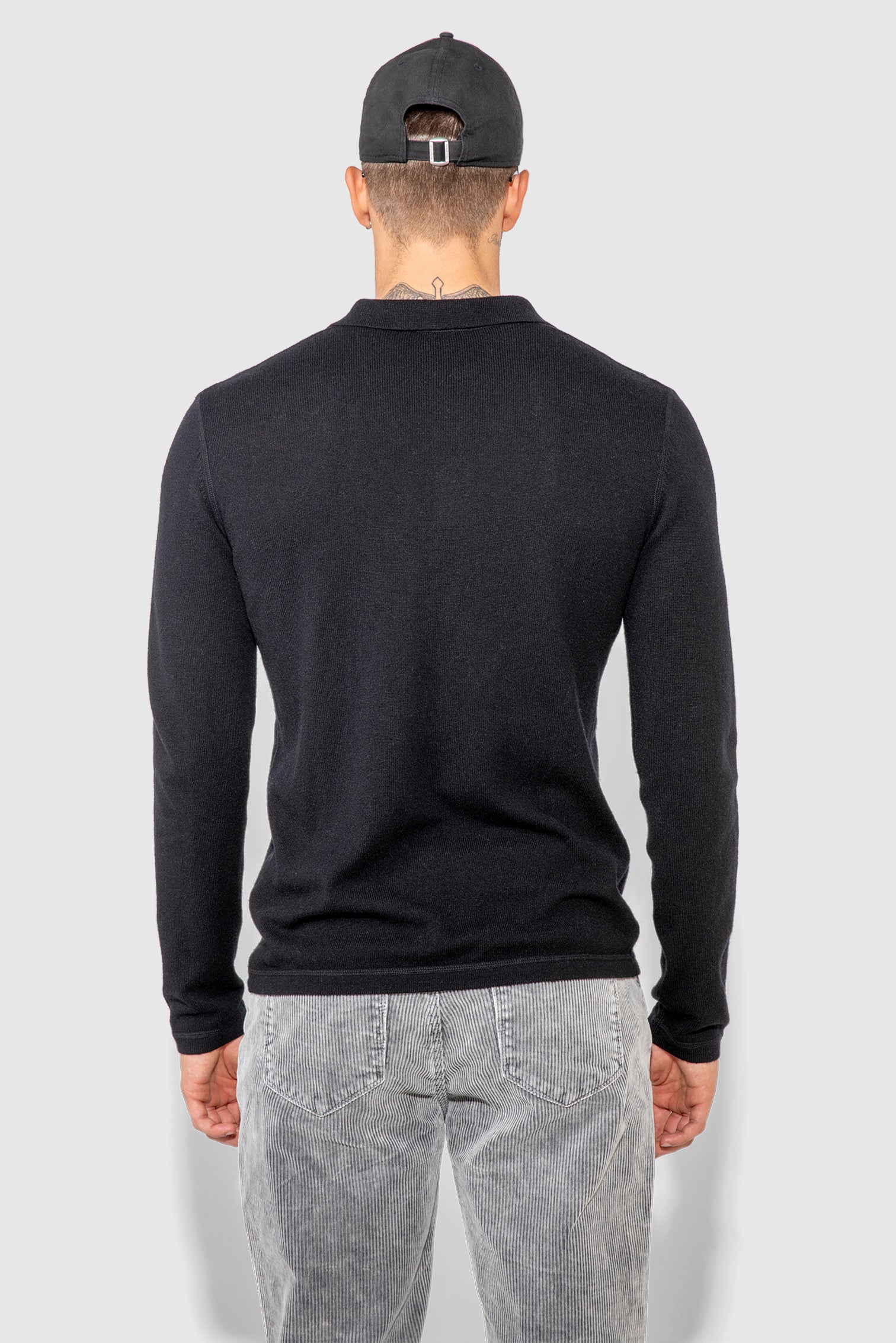 Pierce Long Noir refines the polo into a sharper, more streamlined silhouette. Made from premium stretch cashmere knit, it fits close through the body while moving easily and staying smooth throughout the day. A buttoned collar keeps the neckline clean, ribbed sleeves sharpen the arms, and a curved hem finishes the look with intention. Polished enough to stand alone and comfortable enough to wear all day.